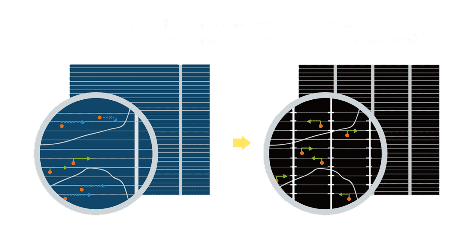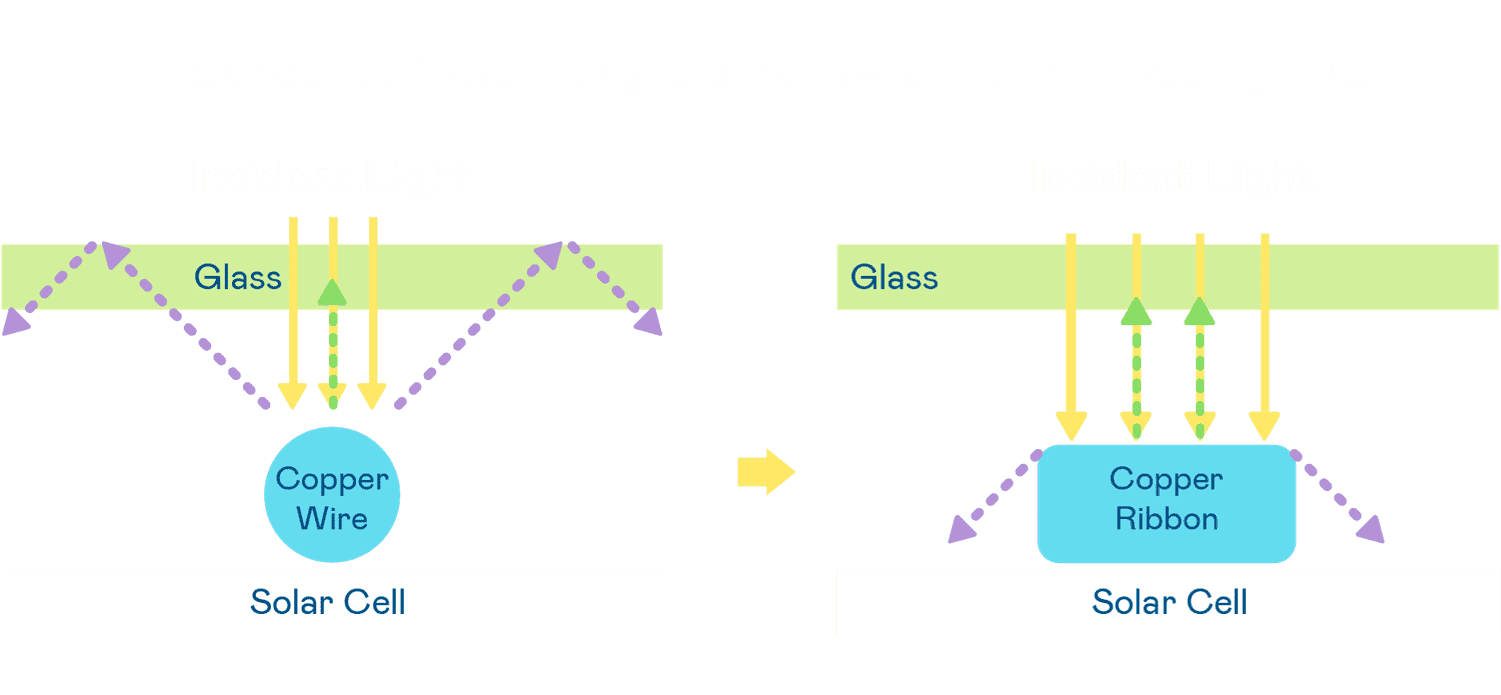 - 电池使用多条铜导线 (Copper wire) 于电池片上形成较短的电流路径,,,提高电流收集效率,,,采用圆形设计的铜导线较传统扁平式的铜焊带 (Ribbon),,,,可增加入射至电池的光线量。。